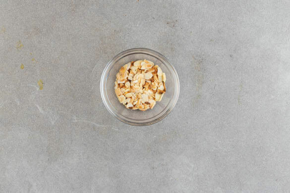 Die Mandelblättchen in einer weiteren großen Pfanne ohne Zugabe von Fett bei mittlerer Hitze 1–2Min. goldbraun anrösten. Vorsicht, sie können schnell zu dunkel werden. Zum Abkühlen herausnehmen und beiseitestellen, die Pfanne aufbewahren.