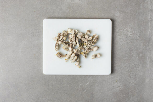 Die Makrele mit einem scharfen Messer von der Haut befreien und in mundgerechte Stücke zupfen, dabei evtl. größere Gräten entfernen.