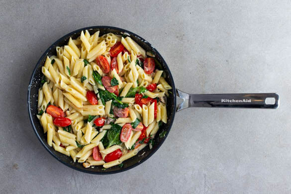 Lust auf Meer? Bitte nicht drängeln, die Fahrt geht gleich los! Sie führt durch mediterrane Küstengewässer, wo wir den Star unseres Pastagerichts vorfinden, die elegante Makrele. Sanft geräuchert blubbert sie nun in einer cremigen Sauce mit fruchtigen Kirschtomaten und Babyspinat. Welch ein Duft! Jetzt aber schnell zurück in den Heimathafen, bevor die hungrige Crew zu meutern beginnt ...