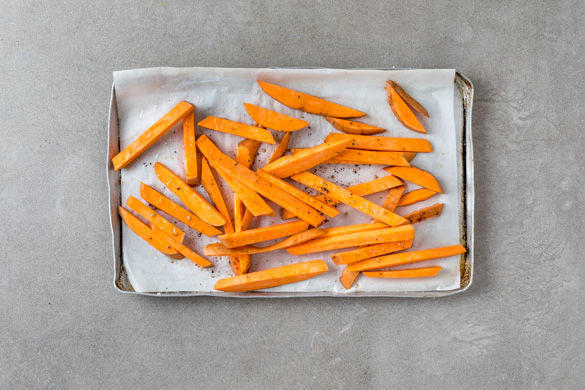 Den Ofen auf 210°C Umluft (230°C Ober-/Unterhitze) vorheizen. Die Süßkartoffeln in 1–2cm dicke Stifte schneiden, auf einem mit Backpapier ausgelegten Blech verteilen und mit 2–3EL Pflanzenöl, Salz und Pfeffer würzen. Ca. 10–15Min. im Ofen garen. Dann auf die Grillfunktion schalten und die Pommes weitere 3–5Min. backen, bis sie knusprig sind.