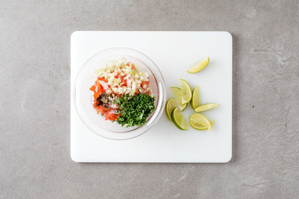 Die Petersilienblätter von den Stängeln zupfen und fein hacken. Die Tomaten, die übrigen Zwiebeln und ca. 2/3 der Petersilie mit 2–3EL Pflanzenöl und 2–3EL Essig vermischen, mit Salz und Pfeffer würzen. Die Limette der Länge nach halbieren und die Limettenhälften in Spalten schneiden.