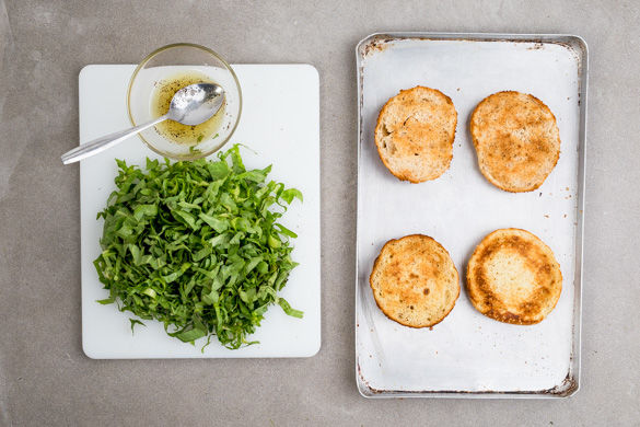 Die Burgerbrötchen im Ofen ca. 1–2Min. aufbacken. Den Romanasalat in feine Streifen schneiden. Aus 1–2EL Olivenöl, 1–2EL Essig, Salz und Pfeffer ein Dressing anrühren.