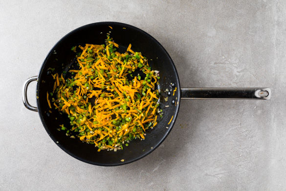 Die Paprika, die Karotten und die Zwiebeln in einer großen Pfanne mit ca. 1–2EL Olivenöl bei mittlerer Hitze 3–4Min. anbraten, bis das Gemüse leicht gebräunt ist. Mit Salz und Pfeffer würzen.
