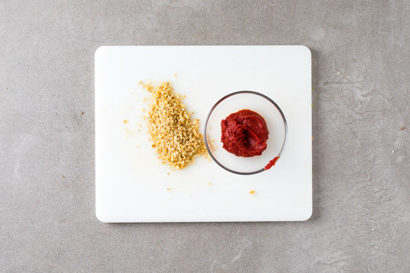 Die Walnüsse grob hacken. Das Tomatenmark mit der Gewürzmischung und 2EL Mehl verrühren.