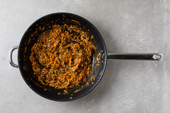 Den Ofen mit der Grillfunktion oder auf höchster Stufe vorheizen. Die Paprika vierteln, entkernen und in ca. 0,5cm kleine Würfel schneiden. Die Karotten schälen, die Enden abschneiden, dann die Karotten mit einer Reibe grob raspeln. Die Zwiebeln schälen, halbieren und fein würfeln. Tipp: Alternativ kann das Gemüse auch in einem Mixer zerkleinert werden.