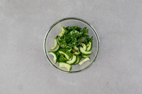 Die Gurke längs halbieren, die Kerne mit einem Löffel herausschaben und die Gurke in Scheiben schneiden. Mit 2EL Olivenöl, 1EL Essig (am besten eignet sich Weißweinessig) und der gehackten Petersilie mischen. Mit Salz und Pfeffer abschmecken.