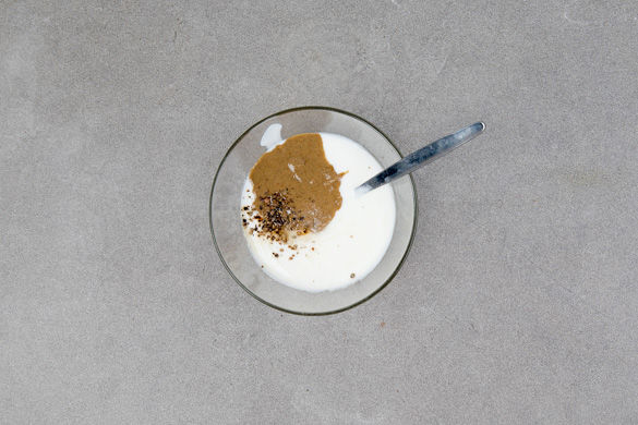 Den Joghurt mit dem Tahini mischen und mit Salz und Pfeffer abschmecken.