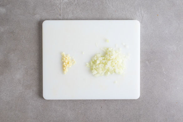 Das Backblech in den Ofen geben und den Backofen bei 230°C Umluft vorheizen. Die Zwiebeln schälen, halbieren und in feine Würfel schneiden. Den Knoblauch schälen und fein hacken.