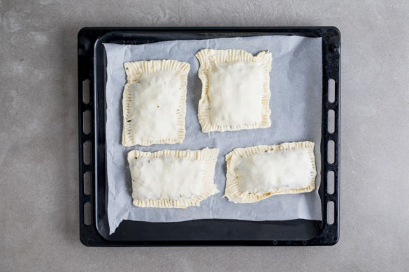 Die Blätterteig mit dem Papier nach unten entrollen und jeweils in 4 Rechtecke schneiden. Auf jedem Teigstück ca. 2–3EL Fleischmasse auf der unteren Hälfte verteilen. Die obere Hälfte darüberklappen und die Ränder mit einer Gabel fest zusammendrücken. Die Empanadas mit dem Papier vorsichtig auf die heißen Backblech legen und ca. 15Min. im Ofen backen.