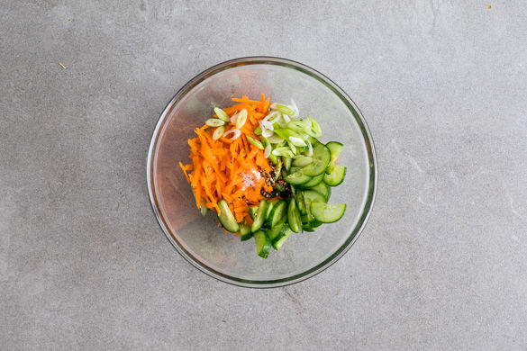 Währenddessen die Enden der Gurke abschneiden, dann die Gurke längs halbieren und quer in dünne Scheiben schneiden. Die grob geraspelten Karotten mit den Gurken vermengen und den Salat mit 1–2EL Olivenöl, 1EL Essig, Salz und Pfeffer abschmecken. Die Frühlingszwiebeln in feine Ringe schneiden und ca. die 1/2 der Zwiebeln unter den Salat mischen.