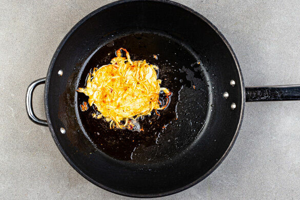 In einer großen Pfanne 2EL Pflanzenöl erwärmen. Eine kleine Kelle Teig in die Pfanne geben, leicht flach drücken und bei mittlerer bis starker Hitze auf jeder Seite in 3–5Min. goldbraun und knusprig braten. Den Puffer auf etwas Küchenkrepp abtropfen lassen und mit Salz und Pfeffer würzen. So fortfahren, bis der Teig aufgebraucht ist.