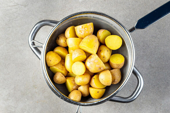 Den Backofen auf 190°C (170°C Umluft) vorheizen. In einem großen Topf ausreichend gesalzenes Wasser für die Kartoffeln zum Kochen bringen. Die Kartoffeln je nach Größe halbieren oder vierteln, dann in das kochende Wasser geben und in 15–20Min. gar kochen. In ein Sieb abgießen und abkühlen lassen.