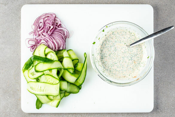 Die Gurke mit einem Sparschäler in breite Streifen schneiden. Die Zwiebel schälen, halbieren und in feine Streifen schneiden. Den Schnittlauch, den Dill sowie die Petersilie samt Stängeln fein schneiden. Den Knoblauch schälen und fein würfeln. Den Joghurt mit den Kräutern, dem Knoblauch, 1TL Paprikapulver und je 1 Prise Salz und Pfeffer verrühren.