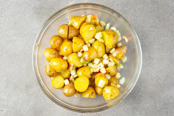 Den Backofen auf 190°C (170°C Umluft) vorheizen. In einem mittelgroßen Topf ausreichend gesalzenes Wasser für die Kartoffeln zum Kochen bringen. Die Kartoffeln je nach Größe halbieren oder vierteln, dann in das kochende Wasser geben und in 15–20Min. gar kochen. In ein Sieb abgießen und abkühlen lassen.