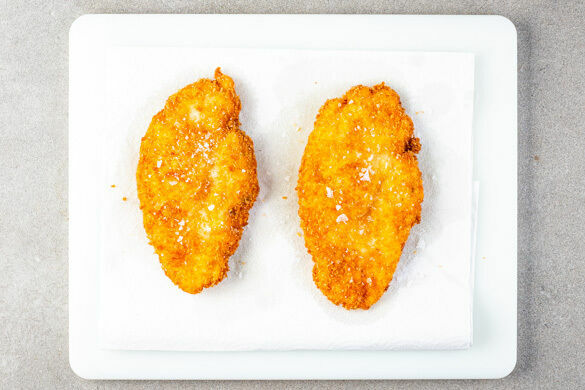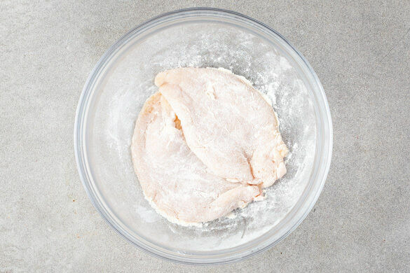 Das Fleisch trocken tupfen, horizontal halbieren und zwischen zwei Lagen Frischhaltefolie oder Backpapier mit einem Fleischklopfer oder dem Boden einer schweren Pfanne flach klopfen, bis das Fleisch 1–2cm dünn ist. Mit Salz und Pfeffer würzen und in 1EL Mehl wenden.
