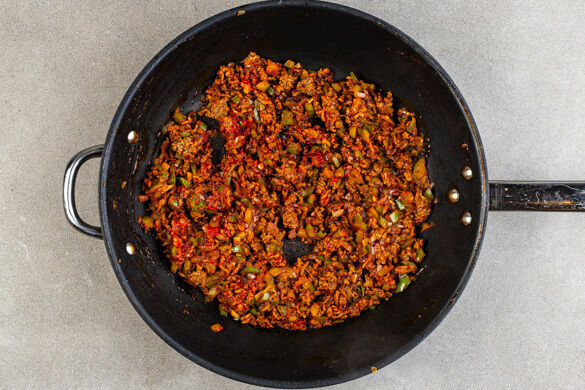 Das Hackfleisch in einer mittelgroßen Pfanne mit 1EL Olivenöl bei mittlerer Hitze in 3–4Min. krümelig anbraten.