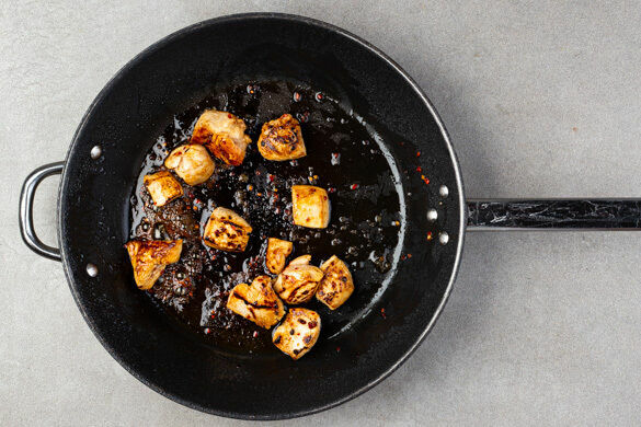 Das Fleisch samt Würzsauce in der Pfanne mit 1TL Pflanzenöl bei mittlerer bis starker Hitze 5–6Min. anbraten. Die Hitze reduzieren, das Fleisch mit 2TL Honig beträufeln und mit 1 Prise Salz würzen. Alles gut verrühren und die Pfanne vom Herd nehmen.