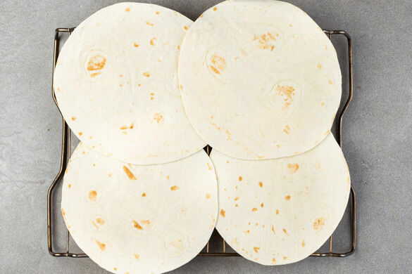 4 Tortillas auf einem Backrost 2–3Min. im Ofen erwärmen. Tipp: Wer mag, kann die übrigen Tortillas in Stücke schneiden, mit Öl und Salz vermischen und bei 180°C in ca. 8Min. zu Tortillachips backen.