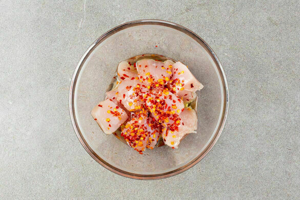 Den Backofen auf 200°C (180°C Umluft) vorheizen. 1TL Chiliflocken, 2EL Pflanzenöl, 2TL Essig und 1/2TL Salz verrühren. Das Fleisch trocken tupfen und mit der Würzsauce vermengen.