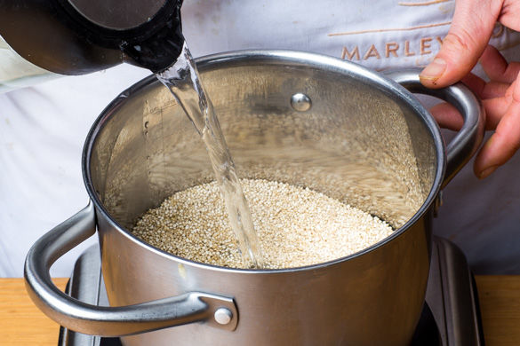 In einem Wasserkocher 600ml Wasser zum Kochen bringen. 150g Quinoa abwiegen oder messen und in einem mittleren Topf mit dem heißen Wasser übergießen. Erneut aufkochen lassen und die Quinoa abgedeckt bei schwacher Hitze ca. 10–12Min. garen. In ein Sieb abgießen, kurz abspülen und abtropfen lassen, dann zurück in den Topf geben und beiseitestellen.