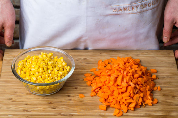 Inzwischen die Karotte schälen, die Enden abschneiden und die Karotte in 0,5–1cm kleine Würfel schneiden. Den Mais in einem Sieb abtropfen lassen.