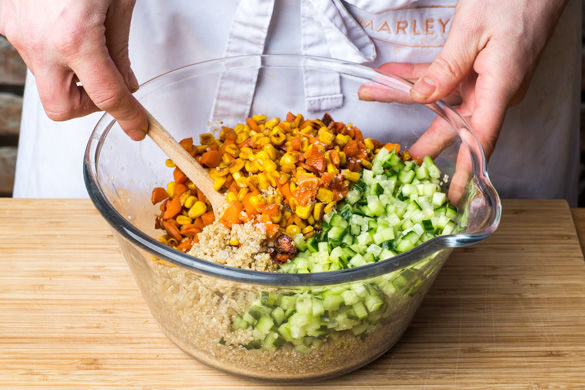 Währenddessen die Quinoa mit den Karotten, dem Mais, den Gurkenwürfeln, 1EL Olivenöl und 1 Prise Salz mischen. Den pochierten Fisch auf der Quinoa anrichten und mit dem gehackten Koriander bestreuen. Die Zwiebeln aus der Marinade nehmen und ebenfalls auf dem Fisch verteilen. Den Zitrussaft nach Geschmack darüberträufeln und das Ceviche servieren.
