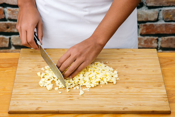 Den Käse möglichst fein hacken. Den Boden einer großen Pfanne mit Öl bedecken und auf hoher Stufe erhitzen. Einen Zwiebelstreifen ins Öl geben: Wenn es aufschäumt und Blasen wirft, ist das Öl heiß genug.