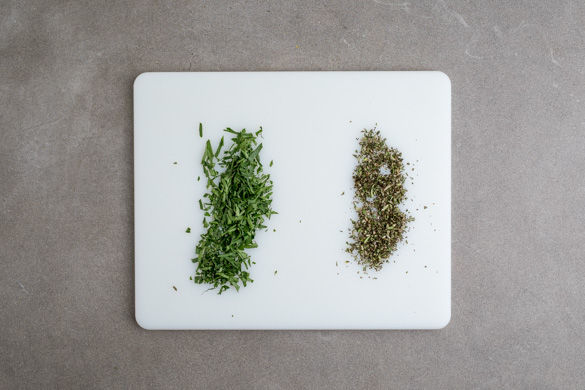 Den Backofen auf 200°C Umluft (220°C Ober-/Unterhitze) vorheizen. Die Rosmarin- und die Thymianblätter von den Stängeln zupfen und fein hacken. Die Petersilienblätter ebenfalls von den Stängeln zupfen und hacken, separat beiseitestellen.