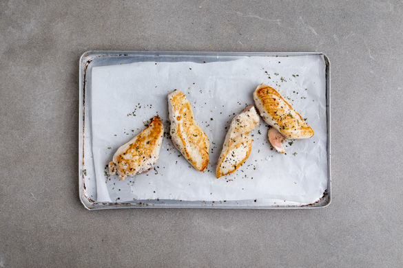 Das Hähnchen in einer mittelgroßen Pfanne mit 1EL Olivenöl für 1–2Min. von jeder Seite scharf anbraten. Auf ein mit Backpapier ausgelegtes Backblech legen, mit Salz und Pfeffer würzen, Thymian und Rosmarin darüber verteilen und für 8–12Min. im Ofen garen. Die Pfanne erneut erhitzen und die Cashewkerne ohne Zugabe von Fett 1–2Min. anrösten.