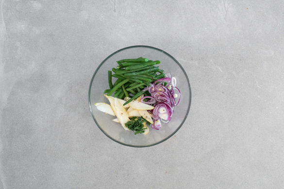 Die Bohnen an beiden Enden vom Strunk befreien und in einem mittelgroßen Topf in ausreichend leicht gesalzenem Wasser in ca. 3–5Min. bissfest kochen. Je nach Geschmack kann man die Bohnen auch weicher oder härter kochen. Nach Ende der gewünschten Garzeit in kaltem Wasser abschrecken und in einem Sieb gut abtropfen lassen.
