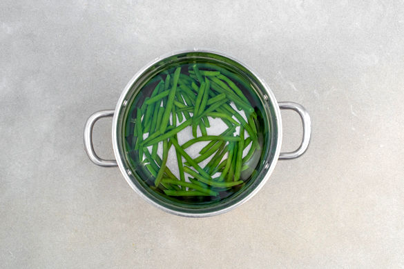 Die Bohnen an beiden Enden vom Strunk befreien und in einem großen Topf in ausreichend leicht gesalzenem Wasser in ca. 3–5Min. bissfest kochen. Je nach Geschmack kann man die Bohnen auch weicher oder härter kochen. Nach Ende der gewünschten Garzeit mit kaltem Wasser abschrecken und in einem Sieb gut abtropfen lassen.