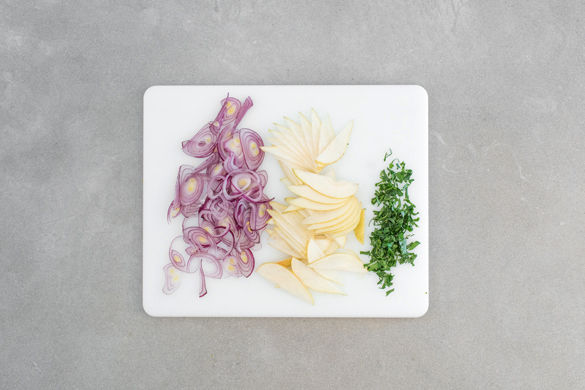 Die Zwiebel schälen, halbieren und in feine Halbringe schneiden. Die Birnen vierteln, entkernen und in möglichst dünne Scheiben schneiden. Die Petersilienblätter von den Stängeln zupfen und fein hacken.