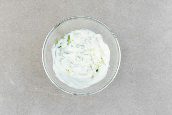 Die Minzeblätter von den Stängeln zupfen und fein schneiden. ⅔ der Minzeblätter mit den restlichen Zwiebeln, dem Joghurt und 1EL Mayonnaise verrühren und mit Salz und Pfeffer abschmecken.