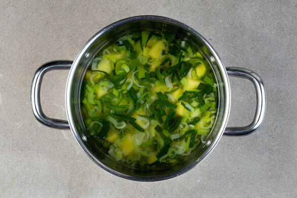 In einem mittelgroßen Topf ausreichend gesalzenes Wasser für die Kartoffeln und den Lauch zum Kochen bringen. Die Kartoffeln schälen und in ca. 2cm große Würfel schneiden, dann mit dem Lauch in das kochende Wasser geben und in 11–15Min. gar kochen. Tipp: Die Kartoffeln sind durch, wenn sie sich bei der Messerprobe leicht vom Messer lösen.