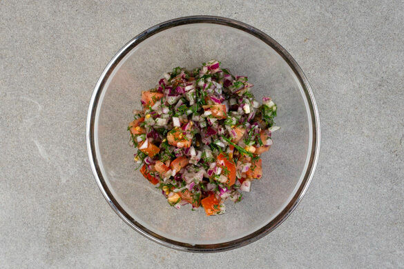 Die Dillspitzen und -stängel getrennt fein schneiden. Die Tomaten in kleine Würfel schneiden. Die Zwiebel schälen, halbieren und fein würfeln, dann mit den Dillspitzen, den Tomaten je 1EL Olivenöl und Essig sowie je 1 Prise Salz und Pfeffer vermengen.