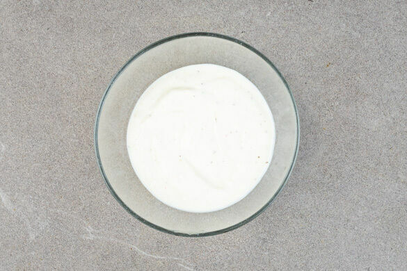 Den Knoblauch schälen und fein würfeln, dann mit dem Joghurt verrühren und mit Salz und Pfeffer abschmecken.