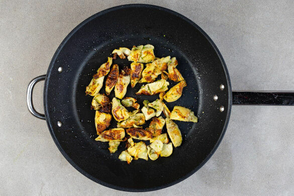 Die Artischocken in einem Sieb mit kaltem Wasser abspülen und abtropfen lassen, anschließend mit den Dillstängeln, 2EL Mehl und je 1 Prise Salz und Pfeffer vermengen. Die Artischocken in einer mittelgroßen Pfanne mit 2EL Olivenöl bei mittlerer bis starker Hitze in ca. 6Min. goldbraun braten, dabei gelegentlich wenden.