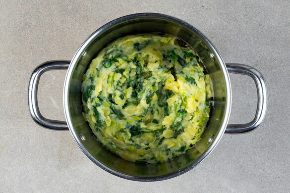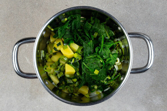 Sobald die Kartoffeln gar sind, den Topf vom Herd nehmen. Den Spinat in das heiße Wasser geben und zusammenfallen lassen. Das Gemüse in ein Sieb abgießen und zurück in den Topf geben.
