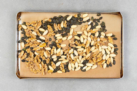 Die Walnüsse, die Mandeln und die Kürbiskerne auf einem mit Backpapier ausgelegten Backblech verteilen und im Ofen in 7–12Min. goldbraun anrösten. Vorsicht, sie können schnell zu dunkel werden. Zum Abkühlen aus dem Ofen nehmen und beiseitestellen. Die Ofentemperatur auf 220°C (200°C Umluft) erhöhen.
