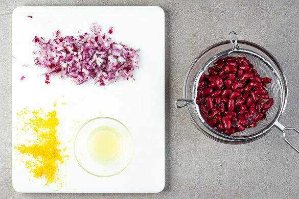 Die Bohnen in einem Sieb mit kaltem Wasser abspülen und abtropfen lassen. Die Zitronenschale abreiben, dann die Zitrone halbieren und auspressen. Die Zwiebel schälen, halbieren und fein würfeln.