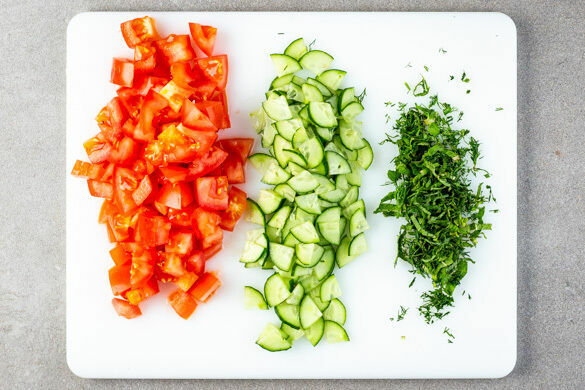 Die Gurke längs vierteln und quer in dünne Scheiben schneiden. Die Tomaten in ca. 1cm große Würfel schneiden. Die Minzeblätter von den Stängeln zupfen und mit dem Dill samt Stängeln fein schneiden.