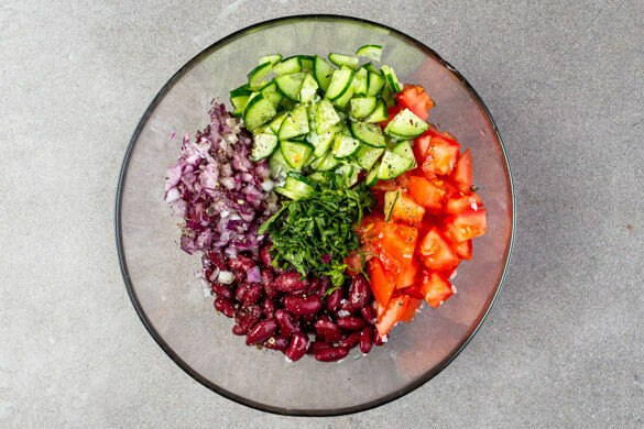 2EL Zitronensaft mit 1EL Olivenöl, 1EL Wasser sowie Salz und Pfeffer nach Geschmack verrühren. Die Kidneybohnen, die Gurken, die Tomaten, die Zwiebeln und die Kräuter mit dem Dressing vermengen und ggf. mit mehr Salz und Pfeffer abschmecken.