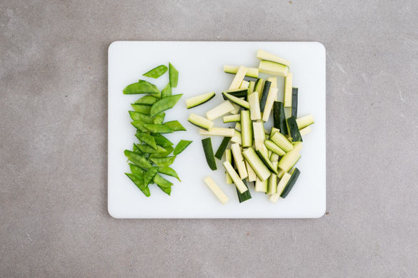 Die Zuckerschoten schräg in ca. 3cm breite Streifen schneiden. Die Enden der Zucchini abschneiden und die Zucchini in ca. 3–4cm lange und ca. 1–2cm breite Stifte schneiden.