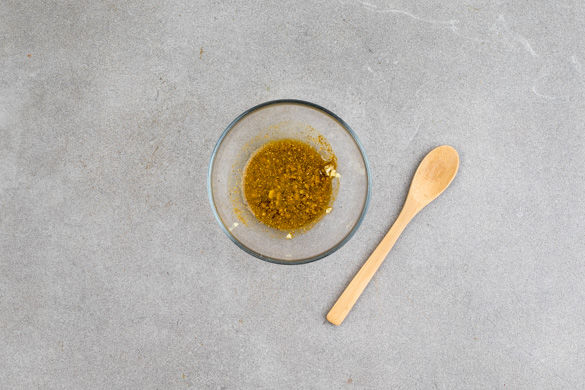 Den Ingwer mithilfe eines Teelöffels schälen und fein hacken. Die restliche Sojasauce mit 6–8EL Wasser, der Gewürzmischung und dem Ingwer vermischen.