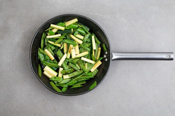 Die Zuckerschoten und die Zucchini in einer großen Pfanne mit 1–2EL Olivenöl ca. 3–4Min. bei mittlerer Hitze anbraten. Mit Salz und Pfeffer würzen.