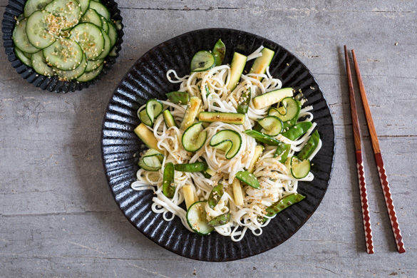 Die aus Japan stammenden dicken Weizennudeln haben es uns so richtig angetan. In der Kombination mit knackig gebratenen Zucchinistreifen und Zuckerschoten in einer feinen Kokosmilch-Ingwer-Sauce sind Udon-Nudeln einfach unschlagbar. Dazu gibt es einen erfrischenden Salat mit Gurke und geröstetem Sesam.