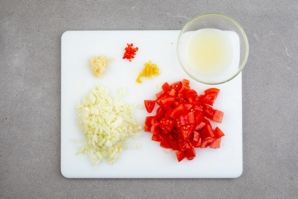 In einem mittelgroßen Topf ausreichend gesalzenes Wasser für die Gnocchi zum Kochen bringen. Die Tomaten würfeln. Die Zwiebel und den Knoblauch schälen und fein würfeln. Die Chilischote längs halbieren und in hauchdünne Streifen schneiden. Die Zitronenschale abreiben, dann die Zitrone halbieren und auspressen.