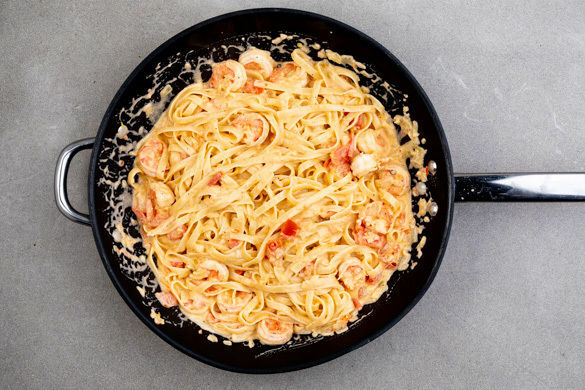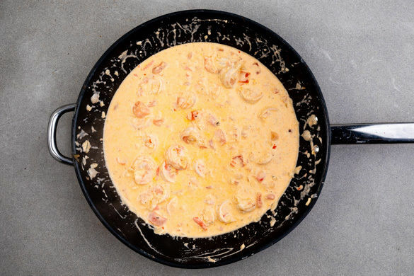 Die Garnelen in einem Sieb mit kaltem Wasser abspülen, trocken tupfen, in die Sauce geben und 3–4Min. mitköcheln, bis sie rosa und gar sind.