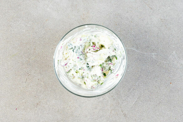 Die Gurke längs vierteln und in ca. 0,5cm kleine Stücke schneiden. Die Crème fraîche glatt rühren, dann die restlichen Zwiebeln, die 1/2 des Dills und die Gurken untermengen. Die Creme nach Geschmack mit dem Zitronenabrieb sowie Salz und Pfeffer würzen.