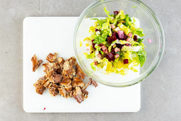 Die Haut der Makrele mit einem scharfen Messer abziehen und den Fisch in ca. 1cm kleine Stücke schneiden. Den Romanasalat in ca. 1cm breite Streifen schneiden, dabei den Strunk entfernen. 2EL Olivenöl, 1–2EL (hellen) Essig, den restlichen Zitronensaft und 1 Prise Salz verrühren und das Dressing mit den Salatstreifen und dem Rote-Bete-Apfel-Gemüse vermengen.